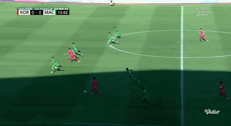 第45+5分钟,韩国队1号球员推射破门将比分扩大,韩国2-0中国澳门