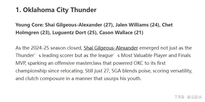 开云入口-当今联盟十大青年军:雷霆力压马刺领跑,火箭湖人入围前五